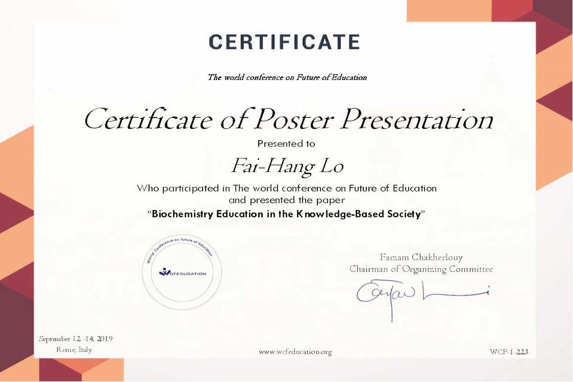I have submitted a poster titled ‘Biochemistry education in the knowledge-based society‘ to the ‘World Conference on Future of Education‘ held in Rome between 12 and 14 September 2019.
