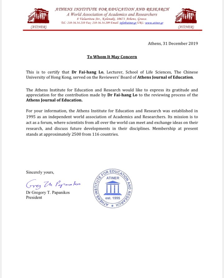It was a nice opportunity for me to serve as a reviewer of an education journal titled ‘Athens Journal of Education‘. Although I have been serving as a reviewer of textbooks and scientific journal, it is my first experience in reviewing educational papers. In 2020, I anticipate that I should be participate more in the field of pedagogical research, which is not only related to science education, but also social science.
