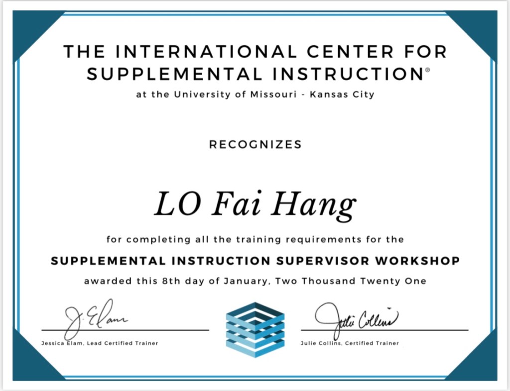 I have completed an online training workshop titled ‘Supplemental Instruction Supervisor Workshop’ offered by the International Center for Supplemental Instruction. The workshop was scheduled from 6 to 8 January and we were interacting globally with the instructors from Kansas City of the United States! From the workshop, teachers in the Chinese University of Hong Kong learnt about the strategies of supplemental instruction, which shed a new light on the modern pedagogical approaches in university.