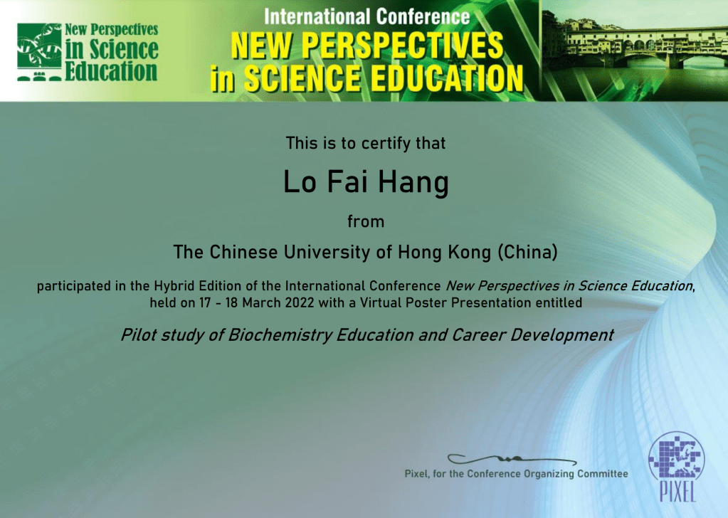 It is my honour to present virtually some of the findings related to biochemistry education and career development during the International Conference New Perspectives in Science Education dated between 17 and 18 March 2022. The title of my poster is ‘Pilot study of biochemistry education and career development‘. This project is funded by the Courseware Development Grant 2019-22 in the Chinese University of Hong Kong, and it was my first attempt on study of this kind. Gratefully, I have been invited to submit a full paper for this study; yet, this project is still on-going and more findings are expected to be obtained and presented in the near future, a full paper will be reserved, perhaps, until next year. I hope I can attend the conference face-to-face in Florence that time.