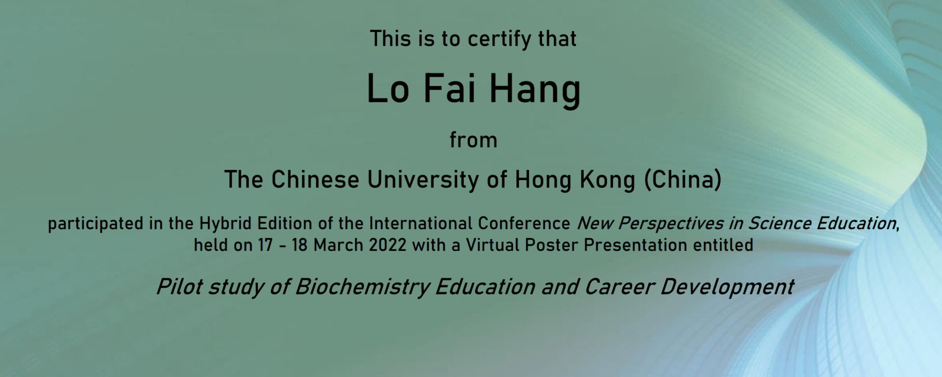It is my honour to present virtually some of the findings related to biochemistry education and career development during the International Conference New Perspectives in Science Education dated between 17 and 18 March 2022. The title of my poster is ‘Pilot study of biochemistry education and career development‘. This project is funded by the Courseware Development Grant 2019-22 in the Chinese University of Hong Kong, and it was my first attempt on study of this kind. Gratefully, I have been invited to submit a full paper for this study; yet, this project is still on-going and more findings are expected to be obtained and presented in the near future, a full paper will be reserved, perhaps, until next year. I hope I can attend the conference face-to-face in Florence that time.