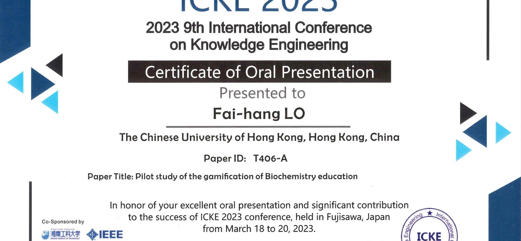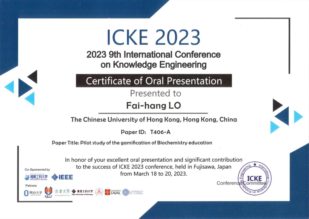 I have the pleasure to join the 9th International Conference on Knowledge Engineering in Japan; it was also my first overseas trip (after Hong Kong is completely back to normal) to present a talk titled ‘pilot study of gamification of Biochemistry education’. I met a lot of experts there and I learned a lot from them about knowledge engineering with innovative technology. I am looking forward to more international exposure in the near future!